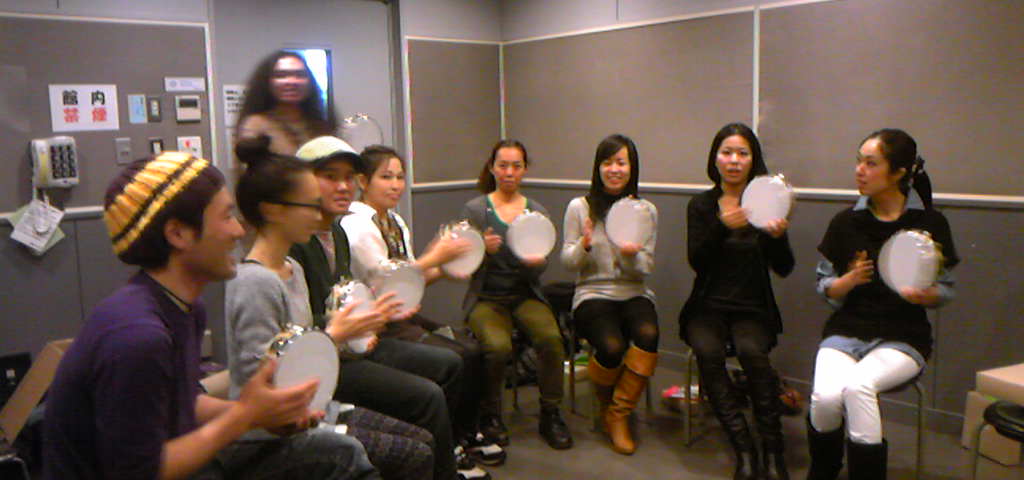田島さんから半永久的(!)レンタルのタンバリンをお借りし、仲良くドゥンの音から練習を始めました。